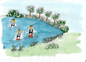 Am nächsten Tag ging es einen kleinen Hügel hinauf, dann aber eine längere Strecke wieder hinunter, was die vier Riesen genossen, denn Anstrengungen hatten sie in letzter Zeit ausreichend gehabt. Da es noch recht warm war und der Schweiß ihnen von der Stirn rann, bereitete ihnen die Aussicht vom Hügel aus auf einen riesigen See große Freude. Ein Bad im Wasser wäre jetzt genau das richtige. Schnell war de See erreicht und sie sprangen, so wie sie waren ins Wasser, obwohl keiner schwimmen konnte. Doch das war anscheinend auch nicht nötig, denn der See war nicht sehr tief. Sie erfrischten sich tobend im Wasser und genossen das kühlende Nass. Nach geraumer Zeit stieg der rote Adler auf und landete wieder am Ufer des Sees, an einer Stelle, wo ein herrlicher Badestand zum Verweilen einlud. „Diesen Platz lass ich mir nicht nehmen, hier bleibe ich und nenne ihn Wildenbruch“, bestimmte Wild. Er war der Meinung, dass er hier mit dem Bruch seiner einstigen Wildheit und seiner Ängste Erfolg haben würde. Außerdem gab es alles, was ein angenehmes Leben versprach: Fische im See, Wasser für Bäume und Pflanzen und vor allem Ruhe. Erneut wurden Apfelkerne geteilt und die restlichen drei Riesen folgten dem Adler zum nächsten verlassenen Ort.