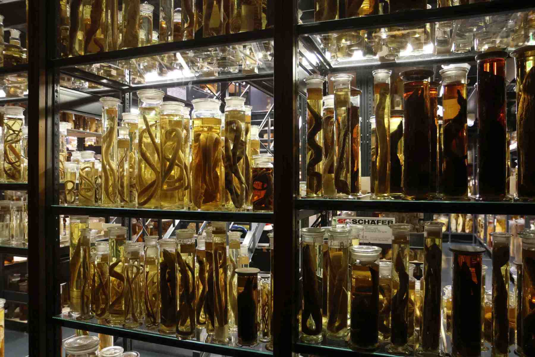 Naturkundliche Forschungsmuseen geben nur einen Teil ihrer Schätze in den öffentlichen Ausstellungen preis. Millionen von Präparaten schlummern hinter den Kulissen in riesigen Magazinen. Die Alkohol-Forschungssammlungen waren seit Jahrzehnten fern ab von den Besuchern und unter unzureichenden konservatorischen Bedingungen unter dem Dach des Museums untergebracht. Heute befinden sie sich in einem der modernsten Sammlungslager der Welt im Ostflügel des Museums. Der Ostflügel wurde im Zweiten Weltkrieg bis auf die Grundpfeiler zerstört. Nach 65 Jahren wurde der Gebäudetrakt – eine der letzten Kriegsruinen Berlins – nach dreijähriger Bauzeit im September 2010 wiedereröffnet. Der Umzug der Alkohol-Präparate war abgeschlossen und das Museum für Naturkunde eröffnete die gläserne Nass-Sammlung als Teil des Ausstellungsrundgangs. In den Nass-Sammlungen werden Objekte aus allen Tiergruppen in einem Gemisch aus 70 Prozent Alkohol und 30 Prozent Wasser aufbewahrt. Das schützt sie vor dem Verfall und sie bleiben für wissenschaftliche Untersuchungen nutzbar. Zu jedem Präparat gehört auch ein Etikett auf dem die Objektdaten dokumentiert sind – ohne sie sind die Präparate wissenschaftlich wertlos. In den Nass-Sammlungen lagern rund eine Million Objekte in insgesamt 80 Tonnen Alkohol. Sie füllen 276.000 Gläser, 12,6 Kilometer Regalfläche und drei Etagen des Sammlungsgebäudes. (Quelle: website Naturkunde Museum Berlin)