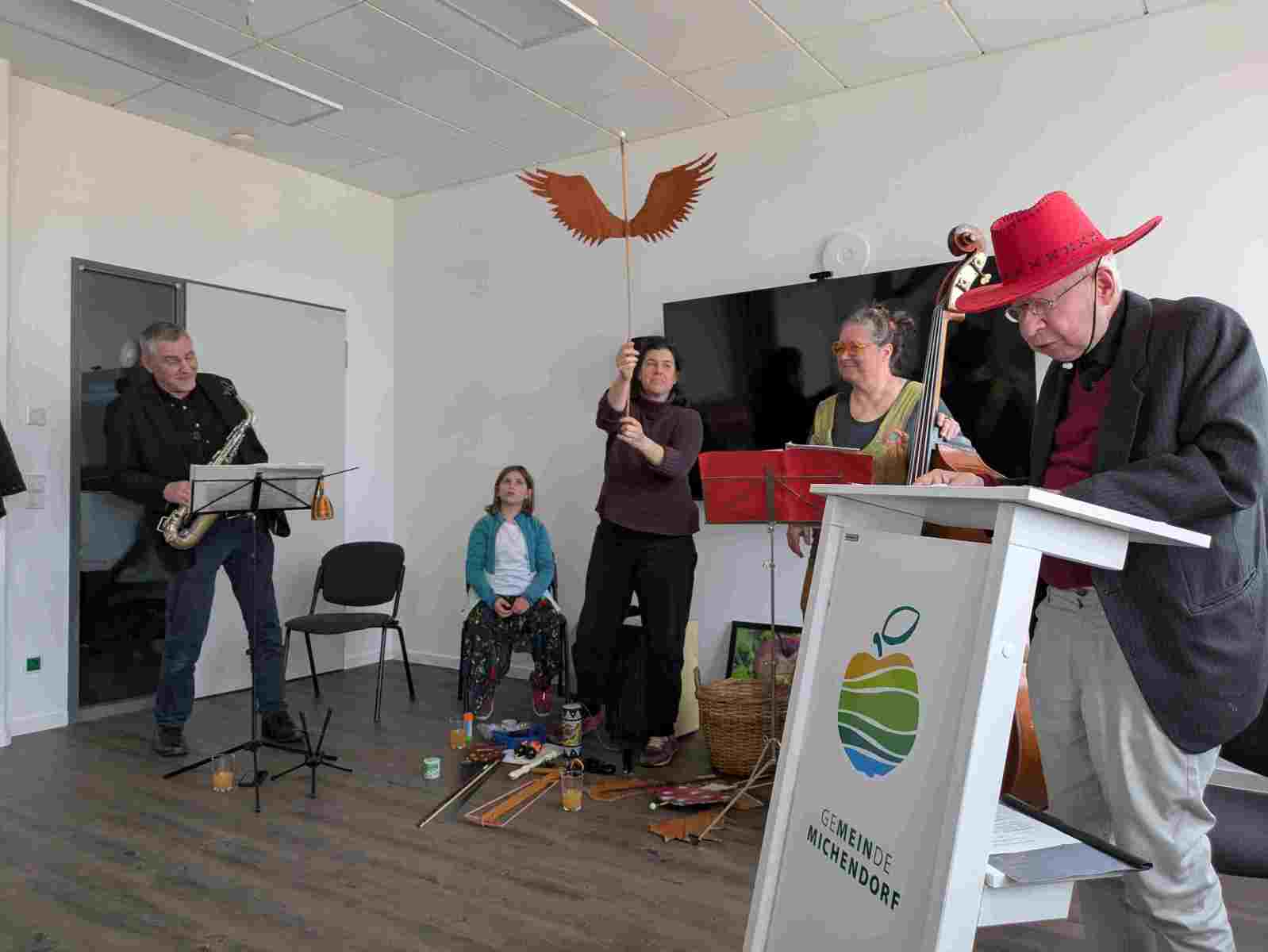 Am 24. März wurde um 15 Uhr im Rathaus das Märchenbuch öffentlich vorgestellt. Im Rahmenprogramm las Jochen Röhrig einige Kapitel aus dem Buch vor, untermalt von der Musik- und Actiongruppe mit Ines Malik am Kontrabass, Poulcheria Tsavdaris (Säge und diverse Instrumente), sowie Ulrich Seitz am Saxophon. Mit Musik und vielen kreativen und witzigen Einlagen begleiteten sie Jochen durch einen Teil es Märchens. Viele Ehrengäste waren der Einladung des Kunstvereins Michendorf gefolgt. Das bunte Programm sollte ein Dankeschön an alle Unterstützer, Helfer und Sponsoren ausdrücken, die das Projekt “Kunstwerk vor dem Rathaus” und das Buchprojekt “Das Märchen vom Wunderbaum in Michendorf” überhaupt erst möglich machten. Die Mitglieder des ehrenamtlichen Kunstvereins trugen mit vielen huntert Arbeitsstunden dazu bei. Alle aktuellen Projekte werden stets mit einem Blog begleitet. Die Entstehung einiger älterer Projekte können im Menü “Abgeschlossene Projekte” nachträglich in Blogs verfolgen werden. Seit Gründung des Vereins 2019, wurden 20 Projekte durchgeführt.