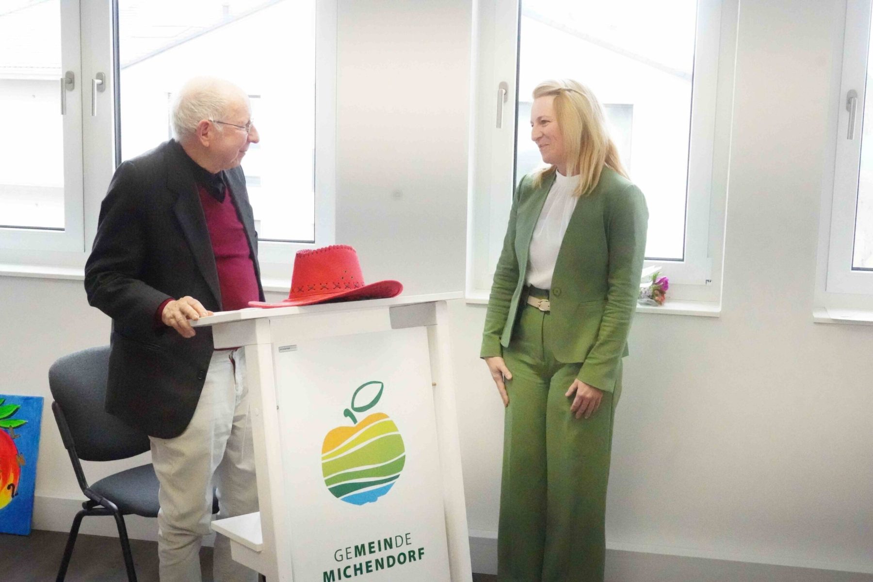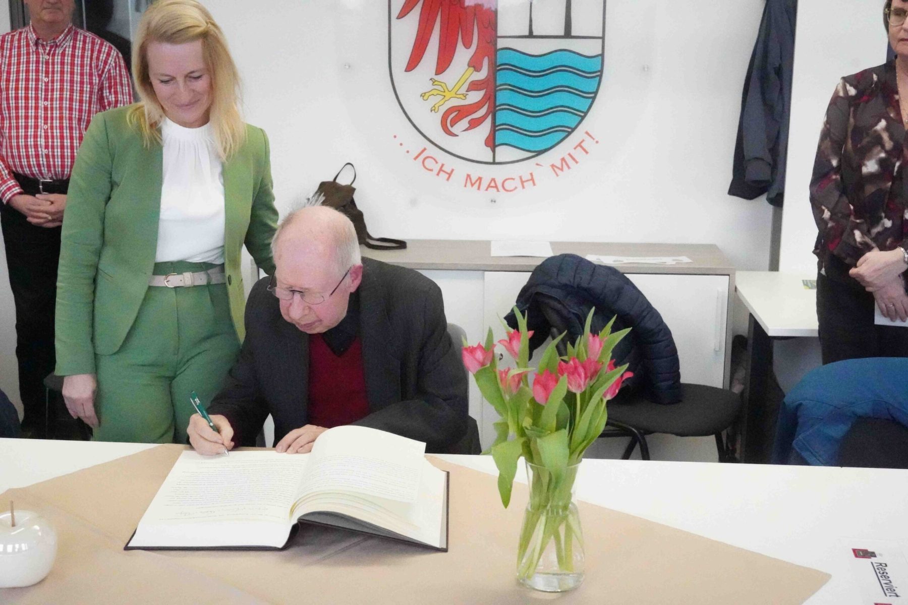 Anschließend wurde der Vorleser zum Überraschungsgast: Frau Nowka dankte den Akteuren auf der Bühne und leitete geschickt zum zweiten Höhepunk des Nachmittags, einer Ehrung für einen verdienstvollen Bürger der Gemeinde, über. Unser Mitglied des Kunstvereins merkte zunächst überhaupt nicht, dass er gemeint war, den alle “Mitwisser” hatten dicht gehalten. Als das Wort “Bibliothekar” fiel, zuckte er zusammen. (Sie meint doch wohl nicht mich) Schnell erholte Jochen sich und trug sich souverän in das “Goldene Buch der Gemeinde Michendorf” ein und verließ als Ehrenbürger erst das Rathaus als alle Gäste mit ihm angestoßen hatten.